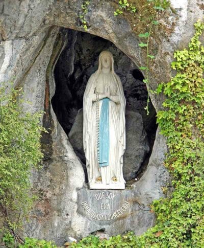 Commencé en 1870, en cette période de guerre et de piété renouvelée, cet édifice fut inauguré en 1872. Reproduction de la célèbre grotte de Lourdes, où la Vierge Marie est apparue à Bernadette Soubirous en 1858, la grotte est bordée de rhododendrons toujours présents depuis l’origine.