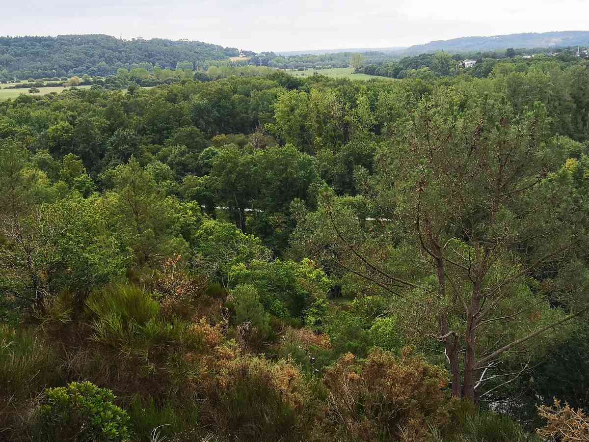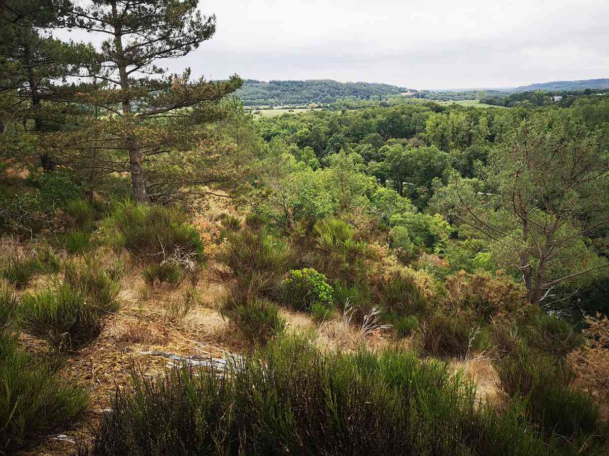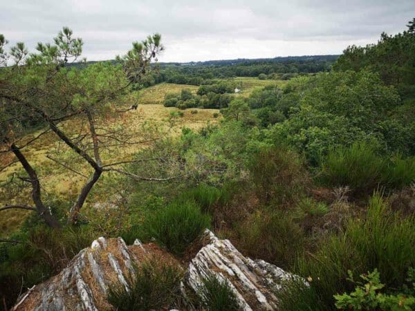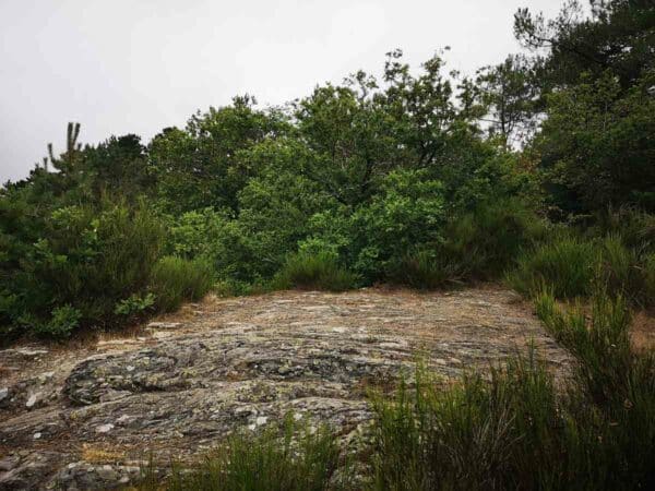 C’est aussi un point de passage d’un chemin de randonnée, qui monte de la vallée. Les roches de schiste affleurent un peu partout, au milieu de cette lande, assez pauvre, couverte d’ajoncs, de genêts, de bruyères et de pins maritimes. On y trouve aussi quelques chênes et châtaigniers sur les hauteurs, et des aulnes dans les fonds marécageux.